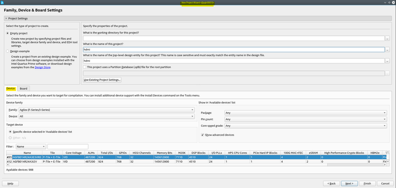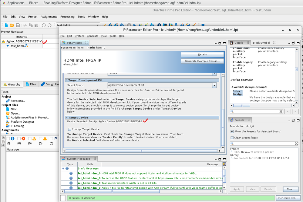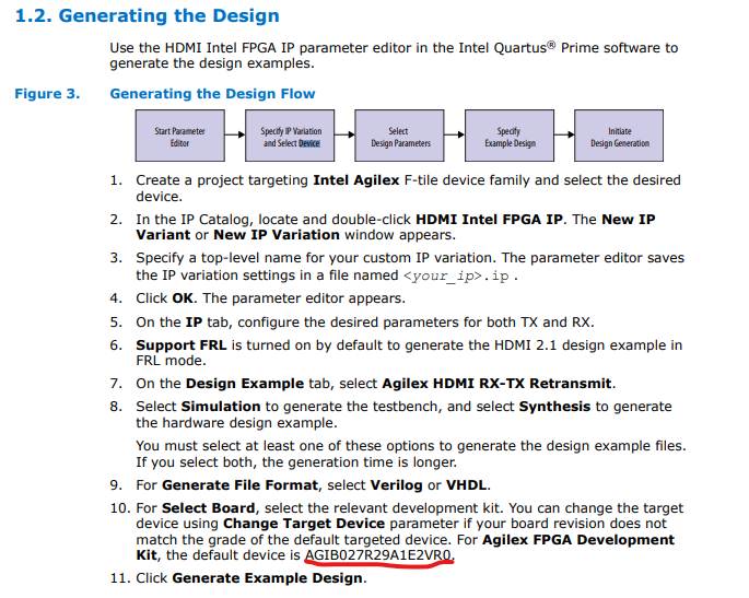 Currently for Agilex device, the HDMI IP Example Design only support I-series device.