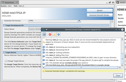I am trying to generate an HDMI TX/RX (if need be one at a time, so be it) example from the HDMI Intel FPGA IP. I run the generate example, but after around 15-20 minutes, I get met with errors. I am attaching the setup and the errors. Any help would be appreciated.