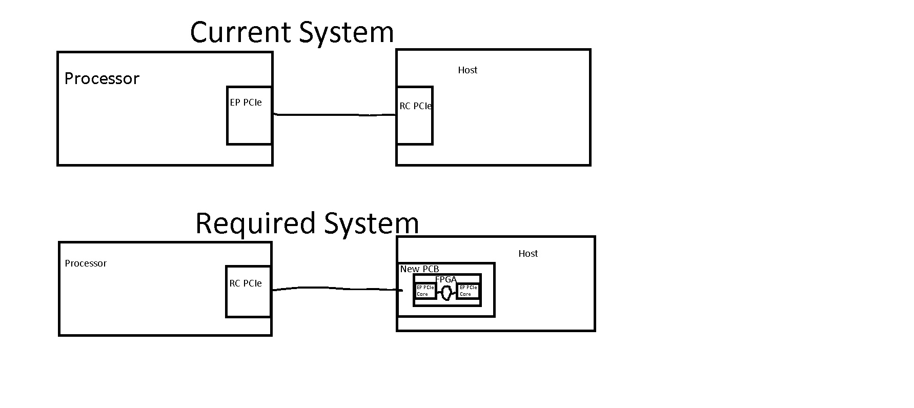 i will describe the system i have today: i have a Root Complex Host and a dedicated EP Processor and they are connected to each other with the PCIe interface. the problem i have is that each time i restart the processor i have to shut down and power up the Host to initiate enumeration process. in order to avoid it i wish to change the processor to be Root Complex and add FPGA with 2 PCIe EP Cores to transfer the TLPs between them. this way the Host and the Processor, each will interface one PCIe EP Core and i will not have enumeration problems. the problem i am facing is to find a solution in which the Host and the Processor will not have to change their functionalities (accept changing the Processor to be Root Complex instead of EP) and to transfer the information between them in "Transparent" way. Do you think there is a way to receive TLP from the Host through its corresponding interfacing FPGA PCIe EP Core, manipulate the TLP header in some way, and forward it to the other FPGA PCIe EP Core to be transmitted to the Processor?