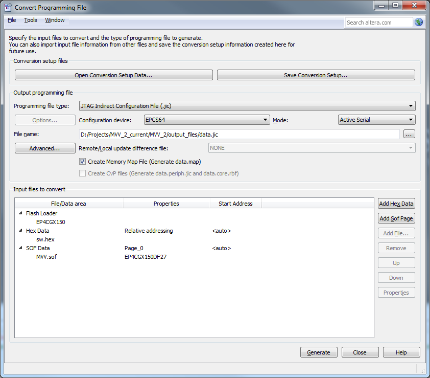 nios2-elf-objcopy -I srec -O ihex sw.flash sw.hexJIC file was created by the dialog window “Convert programming File” with following settings: