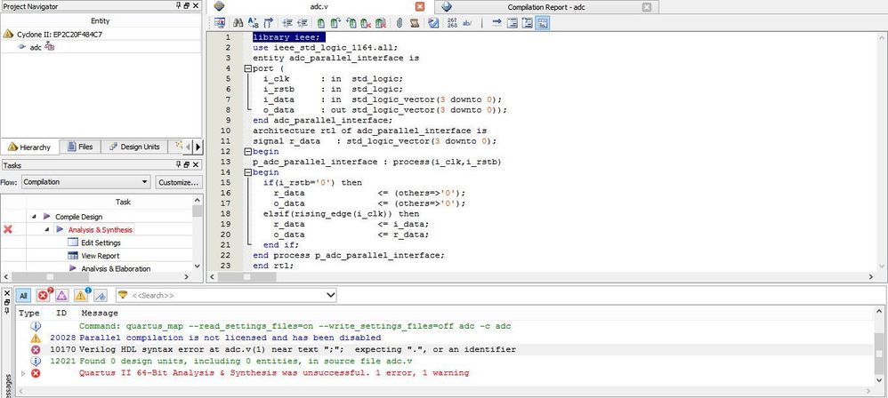 You have written code in VHDL HDL & saved that with verilog extension (*.v), just perform 'Save As..' & save the new file with (*.vhd)extension & remove this abc.v file from project.