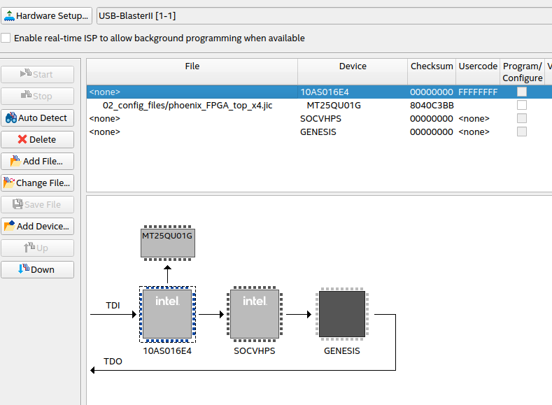When the Intel Quartus Prime Programmer automatically detects devices with shared JTAG IDs, the Programmer prompts you to specify the device in the JTAG chain. If the Programmer does not prompt you to specify the device, you must manually add each device in the JTAG chain to the Programmer, and define the instruction register length of each device.