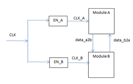 My design has 2 gated clock from the same source CLK: 1. CLK_A is for modiule A, 2. CLK_B is for module B. The design needs to communication between module A and module B. How to constrain the cl...