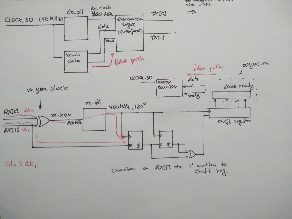 Then I feed that generated clock into a PLL that doubles the frequency (400 MHz) and phase shift it (180 dg) so I can sample the rx0 and rx1 wires to see which one transitioned so I can put a 0 or a 1 in my shift register.