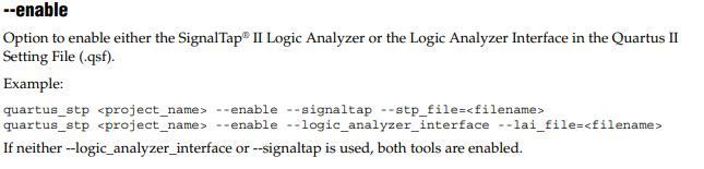 quartus_stp project --stp_file file.stp --enable in a quartus_sh tcl script?If case anyone looking for an answer, you can refer to Quartus Scripting Reference Manual