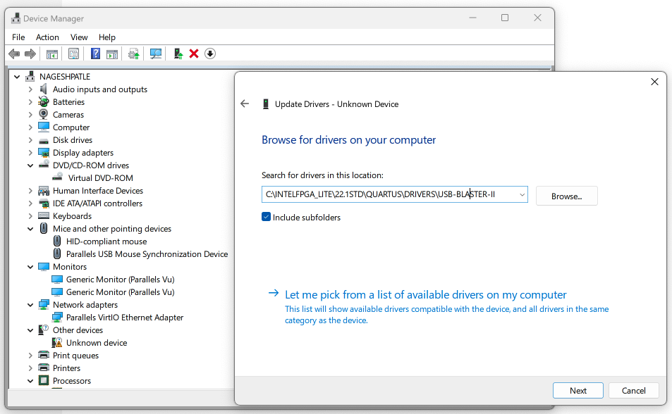 How to install USB Blaster ii drivers for Parallels 18 (Windows 11) running on MacBook M1?