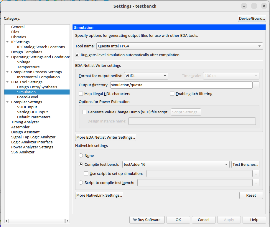Now I'm learning how to create testbenchs and I compiled a file with a simple 16bit adder and its testbench. After configuring the test bench according to the image below: