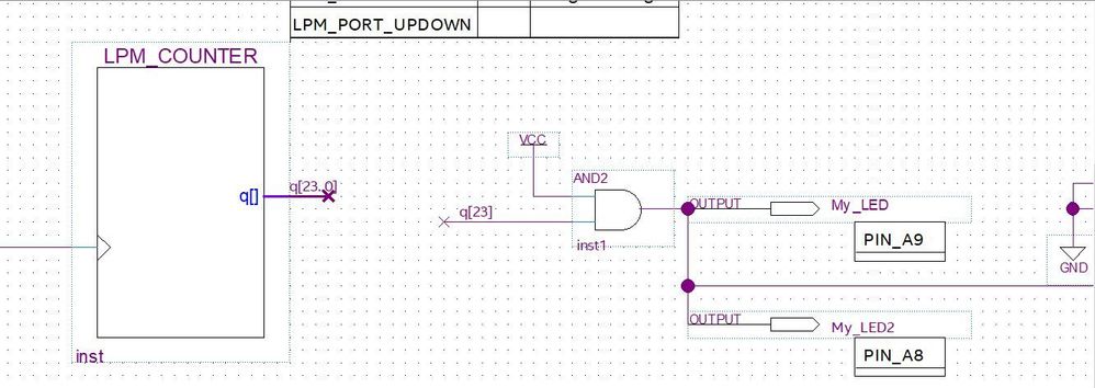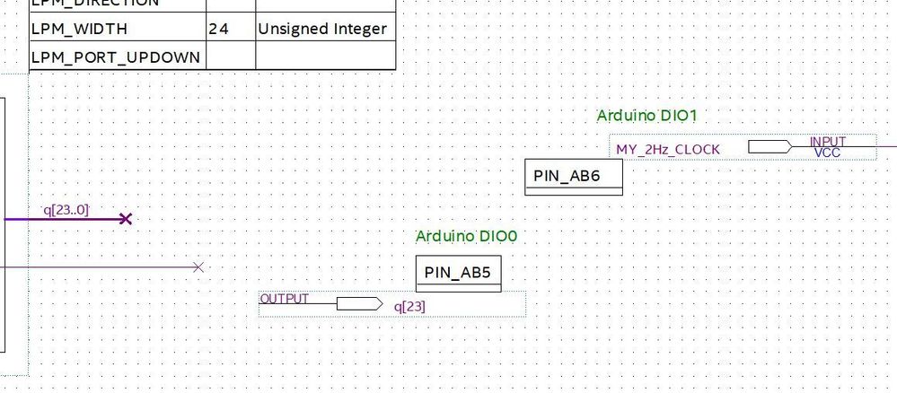 I'm really new to Quartus Prime and the DE10-Lite so I appreciate your basic help. I'm using the LPM Counter to divide down to about a 2 Hz clock and then sending that to an output pin, through a jumper wire plugged into the DE10-Lite board, and back to an input. See logic in my attached image. Is there an easy way to avoid the external jumper and directly connect my divided-down clock signal to other logic in the schematic block? Thanks in advance!
