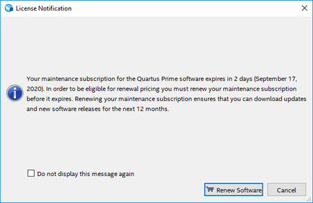 The day after the Quartus Lite v19.1 license expired, Quartus will not proceed beyond the splash screen. No licensing dialogs, no errors, nothing, the app is simply frozen. By the way, I haven't made any recent changes to my PC, so I am sure this is related to the license "expiring".