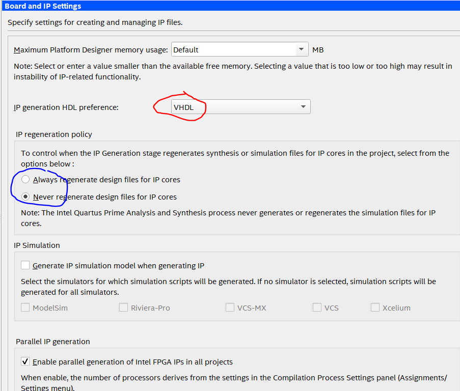 for automatic generation of .ip files, Quartus is using MANAGED_FLOW_HDL_PREFERENCE setting in quartus2.ini, while platform designer uses HDL_PREFERENCE as default for HDL selection.