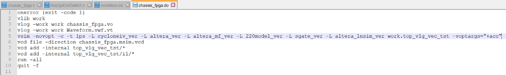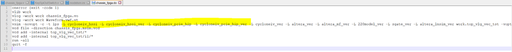 - In the next line you will see the vsim command. Here include the libraries mentioned earlier. "-L cycloneiv_hssi -L cycloneiv_hssi_ver -L cycloneiv_pcie_hip -L cycloneiv_pcie_hip_ver