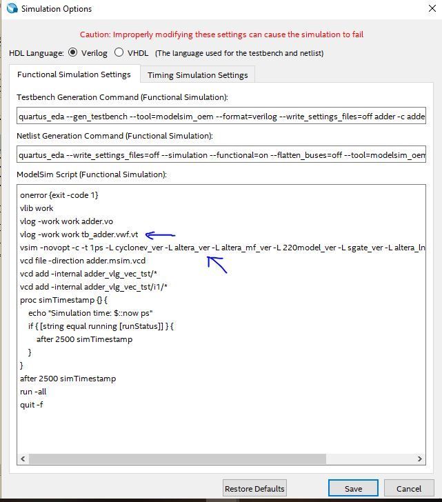 - Under the Modelsim Script box make change the testbench name (*.vwf.vt) .