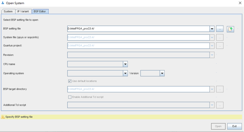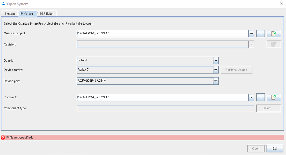 Under System tab, Platform Designer System: click 3 dots and select the .qsys file then Open.