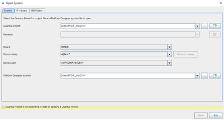 Under System tab, Platform Designer System: click 3 dots and select the .qsys file then Open.