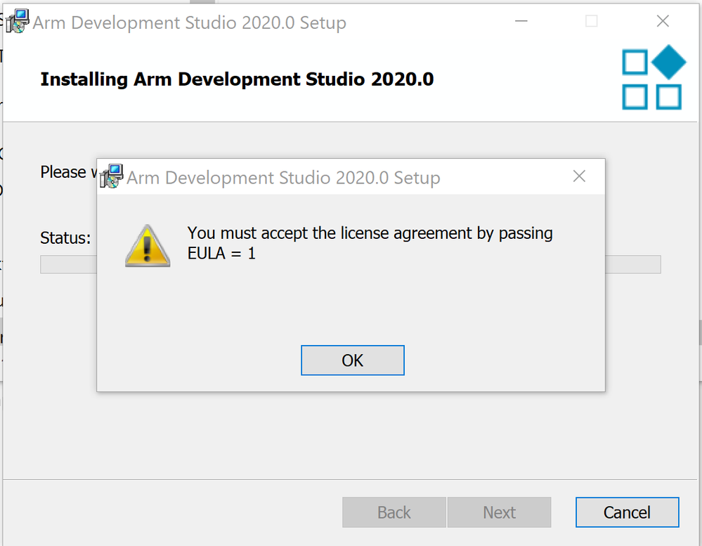 When I was installing the ARM DS 202 on Windows 10, it showed the following error "You must accept the license agreement by passing EULA = 1". Although I did clicked the "accept the License agreement" in the first page. Please help. Thank you.