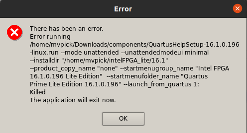 I'm trying to install Quartus lite 16.1 but facing an error. The snap of the error is attached as well. I have already checked the system requirements for the software and my machine satisfies it. Please help me with this.