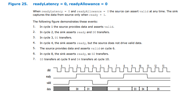 The valid signal qualifies valid data on any cycle where data is being transferred from the source to the sink. On each valid cycle the data signal and other source to sink signals are sampled by the sink.