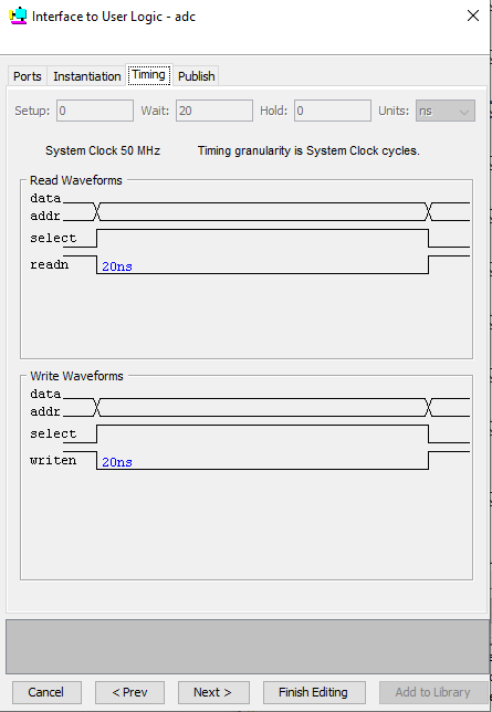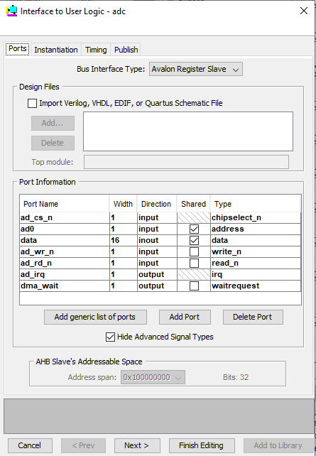 4) Create an Avalon agent (slave) interface with the following signal roles for the signals in your design: rd_n is read_n, clr_irq is readdata, and a0 is address. rxf_n does not conform to any of the Avalon signal roles that I can think of, so you may want to put that in its own separate conduit interface. This is the best mapping I can think of based on your design. Do not add any additional signals on that tab. You have to use the signals that are the ports of your design.