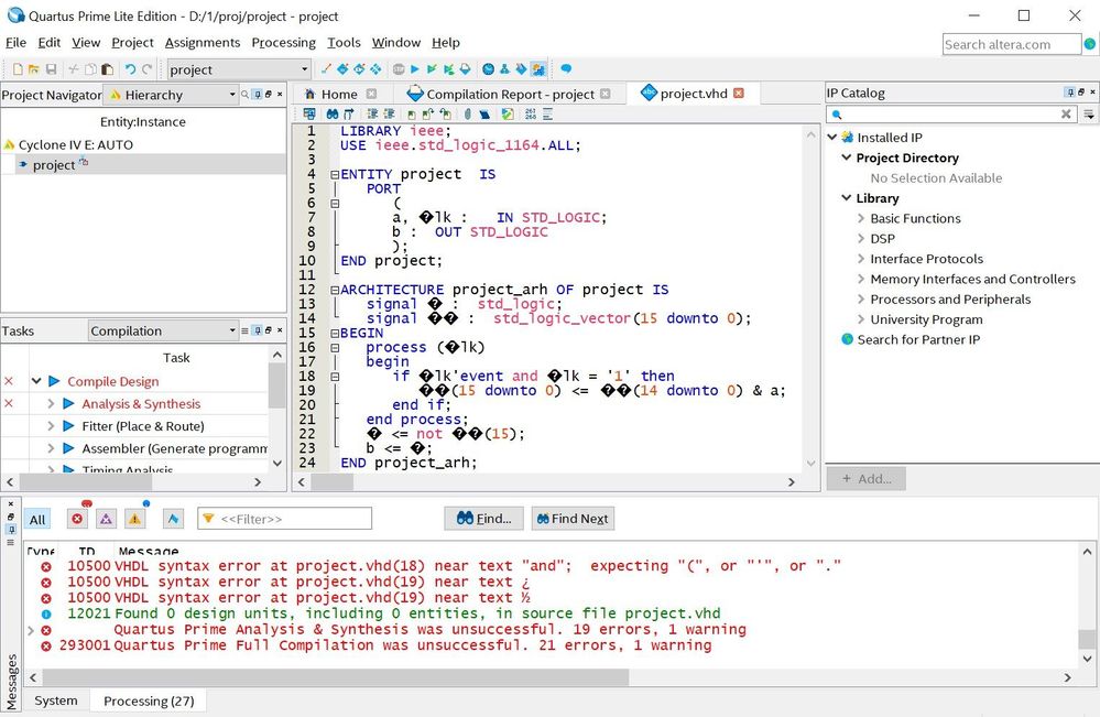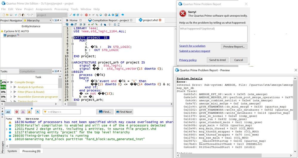 At the stage of Analysis&Synthesys of my VHDL project, the program Quartus Prime Lite 18.1 falls into an internal error. I give the report below. Pre-deleting db and incremental_db folders does not solve the problem. How do I get out of this deadlock?