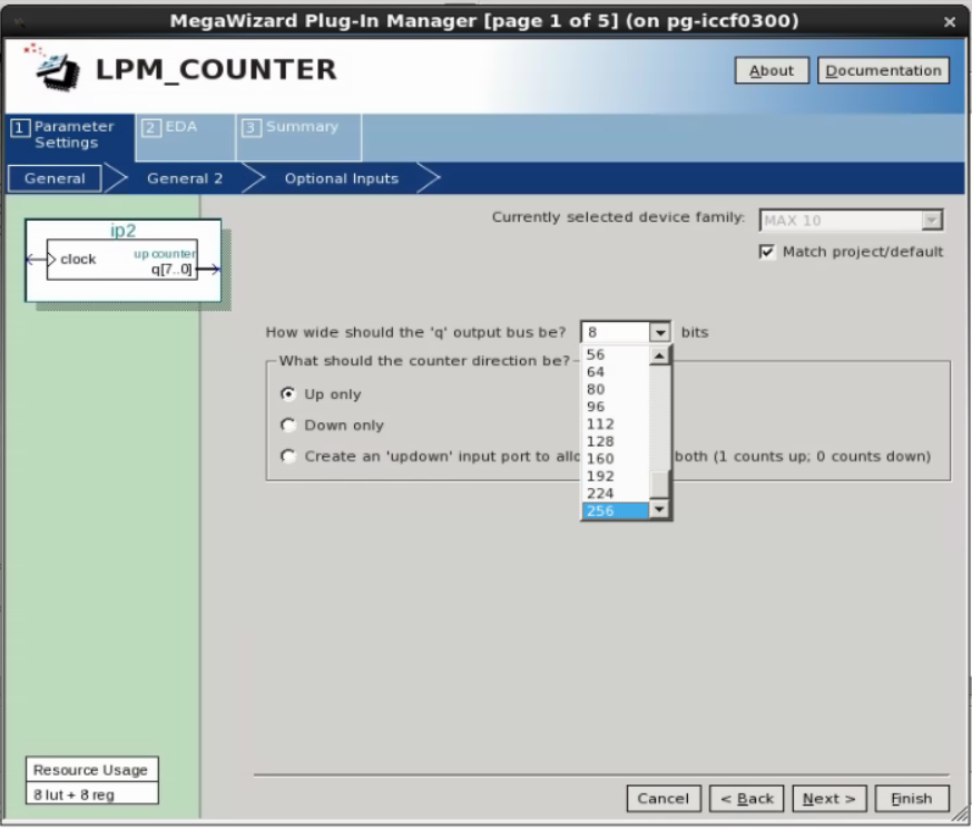 I tried to create a LPM_COUNTER, the maximum width supported is 256. You mentioned that the LPM-COUNTER IP does not work and it is limited to 8 bits. May I know what error you see? Is it a compilation error? Could you share the error message and steps to reproduce the error?