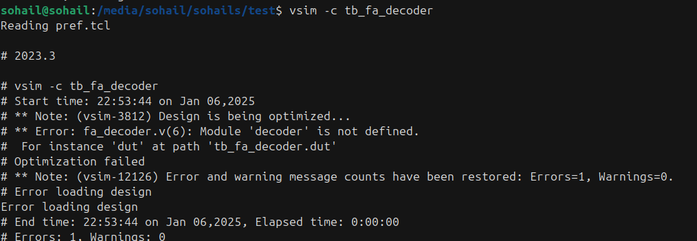- QuestaSim: When I ran the same code in QuestaSim, it correctly reported the error: "Module 'decoder' is not defined", which is the expected behavior.