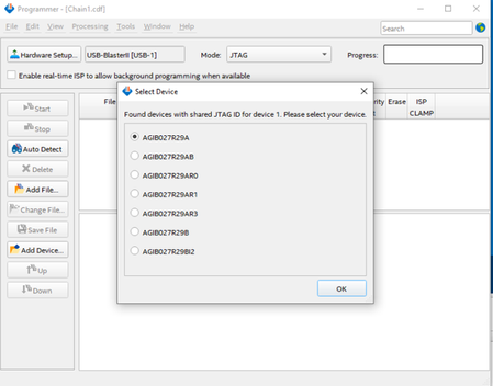 Hi, I am using the Programmer to load the FPGA. This is Quartus 23.4 When I select USB-1 and click on "Auto Detect", it shows me a list of options for the FPGAs. Issue: FPGA that I am using is no...