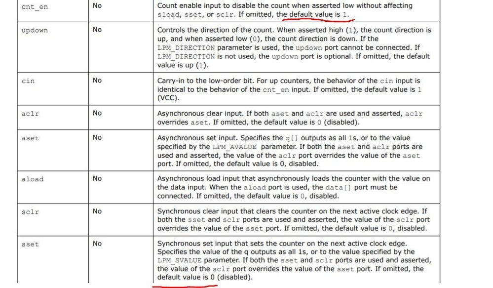 (Because I thought that according to the Intel document (second photo) by default, it sets the values to 1 for cnt_en and 0 for sset, respectively.