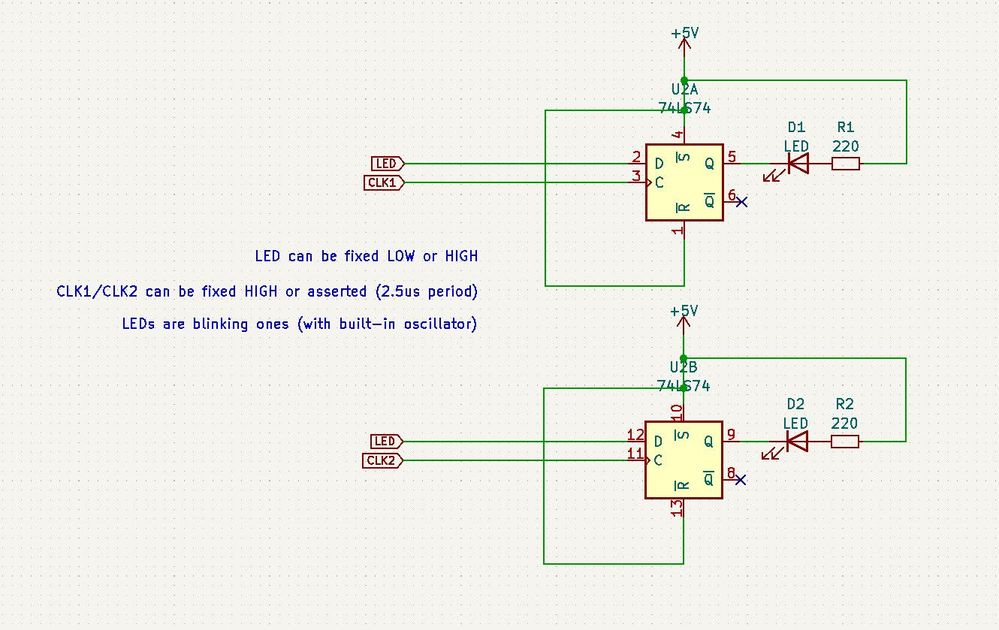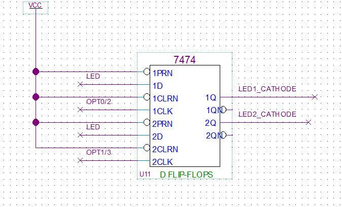 I'm trying to implementing under Quartus this simple LED circuit (based on two D flip-flops) using a +5V CPLD (EPM7032)