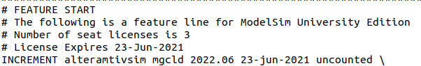 where the dat file is my license file. I was able to use the same license file for Quartus. For firewall, this licence is specifically generated for the IP address of this computer and I was able to use Quartus just fine so I don't understand why modelsim doesn't work. Below attach the beginning of the license. I think one thing bothers me is in the comment that the expiration data is the same day that I applied for this license. Not sure if this may cause problem?