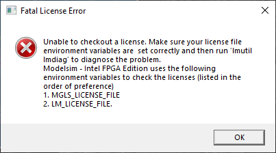 For ModelSim software, you must set an environment variable the location of license. You need to specify location of the license file using the LM_LICENSE_FILE system variable (click/checkout the Use LM_LICENSE_FILE variable). You need to set your LM_LICENSE_FILE environment variable to point to the license that Intel provide. c:\intel\license.dat or something similar.