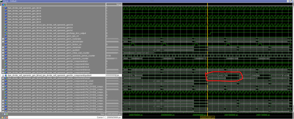 I have implemented a divider in a custom VHDL module in order to replace the instances of the LPM_DIVIDE IPs in my project. I've then checked the functionality of my module against the LPM_DIVIDE and verified through a simulation that, with the exception of a different initial latency, my divider behaves exactly the same way of the LPM_DIVIDE IP, covering all the dynamic of the input operands. The problem is that when I test it on the hardware, I have some slightly different results. Debugging the problem with SignalTap, I verified that the problem was due to a different behavior of the LPM_DIVIDE IP on the hardware with respect to the simulation. I verified that the different behavior occurs when the result of the division has a negative sign. I have attached the results of the simulation and of the acquisition on SignalTap in case of a division between a negative numerator and a positive denominator. The correct result should be the one of the simulation (0xFF..FFF4FF), but for a reason that I still don't understand, in the hardware implementation the result is 0xFF..FFF4FE. Do you have any suggestion? Is there some kind of rounding in the implementation that is not present in the simulation model?