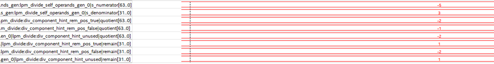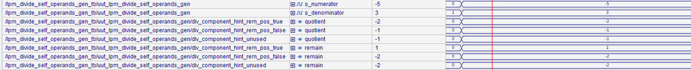 For confirmation, I attached a more simple version of the lpm_divide_self_operands_gen.vhd, where I instantiate 3 version of the LPM_DIVIDE function with only 1 stage of pipeline, as you suggested and with the parameter LPM_HINT set to "LPM_REMAINDERPOSITIVE=TRUE", "LPM_REMAINDERPOSITIVE=FALSE" and "UNUSED". I also update the lpm_divide_self_operands_gen_tb.vhd setting the denominator width to 32 (it is an allowed value). The operators are now simply -5 and 3. If you simulate the module you'll get that the outputs are the following: