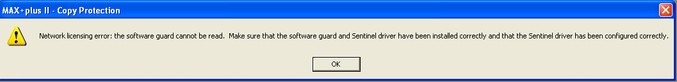 I have an old design targeting the EPF10K100 which needs to be re-compiled by the original toolchain. I found in the archive the installation files for max+plusII 10.0, the license.dat and a matching USB Sentinel Safeguard (acc. the ID in the license file). Unfortunately I cannot get the max+plusII recognize the Software Guard. On start of max+plusII I get the error "Network licensing error: the software guard cannot be read. Make sure that the software guard and the Sentinel drive have been installed correctly."