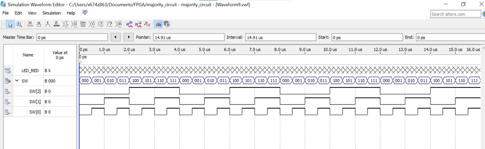 As I downloaded Quartus II 13.0 web edition, I am able to create the webform. However, I have a new issue now. I have created a majority circuit ( output will be high if any two of three inputs are high).