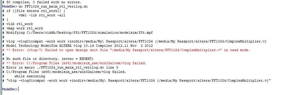 Hi Riddhi, You're getting this error might be because of invalid filename that you are trying to pass to vlog. Check previous thread with similar issues. https://forums.intel.com/s/question/0D50P00003yyQLWSA2/modelsim-error-vcom7-failed-to-open-design-unit-file-in-read-mode?language=en_US https://forums.intel.com/s/question/0D50P00003yyLk2SAE/error-vcom7-failed-to-open-design-unit-file-in-modelsim?language=en_US Thank you. - Abe