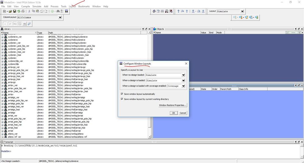 Please correct me, as per my understanding If I am not mistaken you are facing issue of default view/layout of Modelsim window.