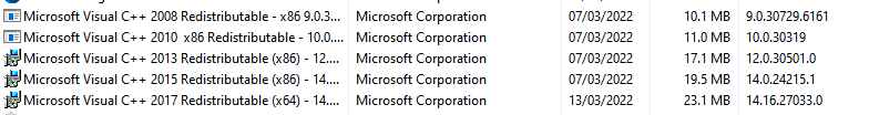 I've Microsoft Visual C++ 2008, 2010, 2013, 2015 and 2017 installed too.