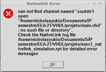 Nativelink TCL script failed with errorInfo: can not find channel named "couldn't open "/home/nicholasyukio/Documents/5º semestre/EEA-21/VHDL/projeto/main.vhd": no such file or directory"