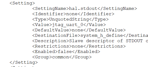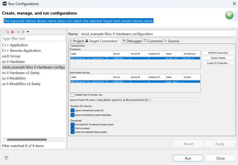 I've made to through all the steps of creating the design in platform designer, compiling, programming the design to the board (DE10-Lite), generating the BSP, and building the project in Eclipse with no issue. Even when I run the hardware configuration, I get no errors, but nothing prints to the Nios II Console. I've tried running a simple math program in the debugger, and it seems like the Nios CPU is executing instructions, but when it comes to printing to stdout, nothing shows up. When I open the run configuration window in the Target Connections section, I get the message "The expected Stdout device name does not match the selected target byte stream device name." How can I find the stdout device name? How can I find the selected target byte stream device name? How can I change either of these so that they match? I'm not sure how to fix this error or if it is even the source of why nothing is printing to stdout, but it's all I have right now. I'm using Quartus Lite Version 22.1