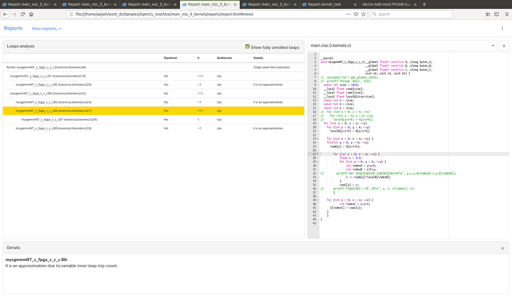 I am looking at the generated report for my matrix multiply OpenCL kernel and the report is telling me that it is unable to estimate the II and the bottleneck is showing as 'n/a'. Any ideas what might be the reason for this? I am using version 18.0 of the tools, and I am attaching a screenshot of the loop analysis report (which shows my code)