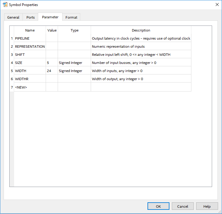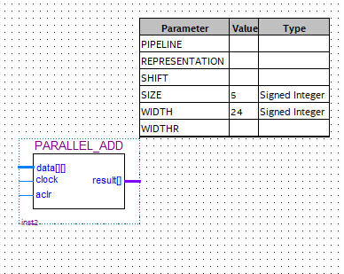 I'm building a FIR filter using Quartus Prime Lite Edition and I want to place a parallel_add block to add all my bus streams, problem is I can't alter the block to have it look like, for example, the second image I uploaded called p_add_5 in order to be able to add five buses. How do I do it?