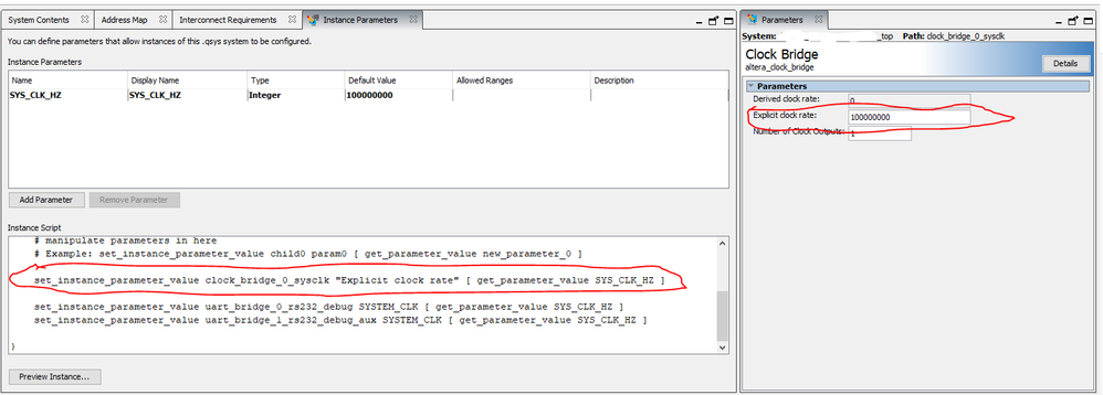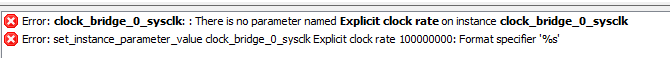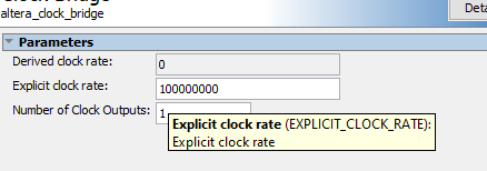 Attempting to make use of instance parameters to synchronise all dependencies in a subsystem -- basically component editor generated custom component parameters works great but I am finding it tricky to set desirable library component parameters eg Clock Bridge :: Explicit clock rate: