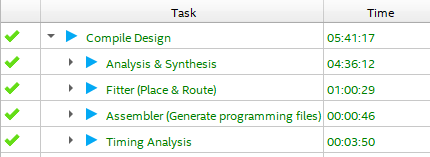 Most of the time is spent in Analysis&Synthesis: the i7 takes about 4h and the i9 2.5h here.