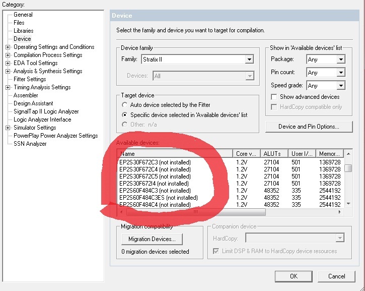 That' because when you install quartus ii, some devices you do not check to install. So you can reinstall quartus ii and check those devices to install. Default is that all devices be checked to install.