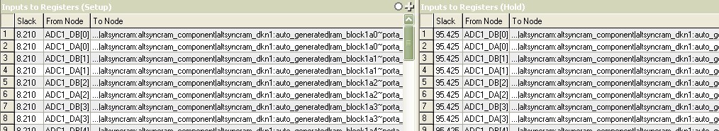 I use FPGA to capture 6 channel ADC output simutaneously. The pin of ADC output clock is COUT and 8MHz. The width of ADC output data is 16 bits. The time of valid data is about half of the period of COUT, that is, 62.5 ns. The relation between COUT and DAB( pin name of output data) is as follows: https://www.alteraforum.com/forum/attachment.php?attachmentid=3899 the timing specification of ADC is as follows: https://www.alteraforum.com/forum/attachment.php?attachmentid=3900 I use the following commands to constrain the source-synchronous input: --- Quote Start --- # base clock, 90 degree phase shift create_clock -name {adc_cout} -period 125.000 -waveform { 31.250 93.750 } [get_ports { ADC3_COUT ADC2_COUT ADC1_COUT }] # virtual clock, for set_input_delay create_clock -name {adc_virt_cout} -period 125.000 -waveform { 0.000 62.500 } # set input delay set_input_delay -add_delay -max -clock [get_clocks {adc_virt_cout}] 54.500 [get_ports {ADC1_DA[0]}] set_input_delay -add_delay -min -clock [get_clocks {adc_virt_cout}] 2.000 [get_ports {ADC1_DA[0]}] set_input_delay -add_delay -max -clock [get_clocks {adc_virt_cout}] 54.500 [get_ports {ADC1_DA[1]}] set_input_delay -add_delay -min -clock [get_clocks {adc_virt_cout}] 2.000 [get_ports {ADC1_DA[1]}] ... --- Quote End --- After reporting timing, the setup slack is: https://www.alteraforum.com/forum/attachment.php?attachmentid=3901 the hold slack is: https://www.alteraforum.com/forum/attachment.php?attachmentid=3902 I still couldn't figure out what went wrong. Could anyone please help me? Thanks!