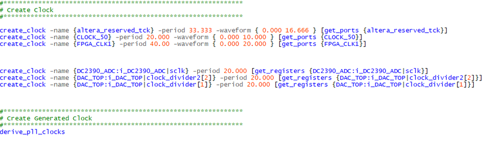 No, you didn't have to break out the PLL output clocks like that. derive_pll_clocks is fine. I was referring to the 3 extra create_clock statements you have (sclk, clk_divider...). Those are coming from internal registers, not an input port of the device, so they should be in your .sdc as create_generated_clock commands, not create_clock.