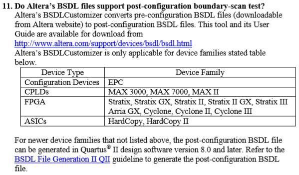 I need assistance generating post-configuration BSDL files for the legacy Intel/Altera Flex 10K family of FPGAs. I found a “BSDL_FAQs” document on Intel’s website that has a description below of their “BSDLCustomizer” tool used for generating post-configuration BSDL files. The Flex 10K family is not listed as a device type supported by this tool.