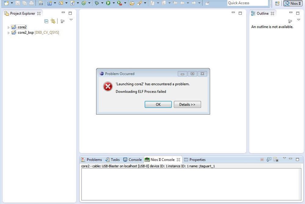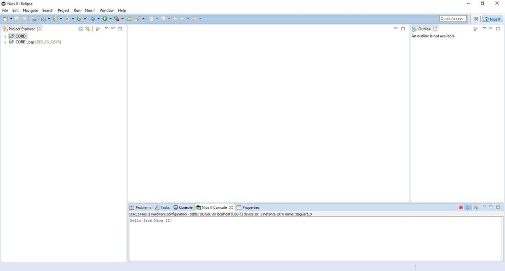 endmoduleWhen I compile this, it compiles correctly and I can program my board. I use NIOSII to start a HelloWold application. I can successfully run that on core1.