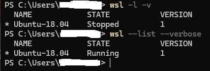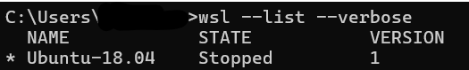 • Open a command prompt and type "wsl --list --verbose". You should get something like the following:
