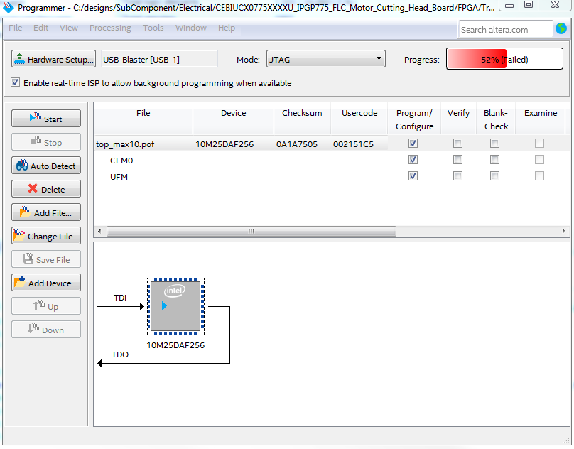 Can you provide the error message log in the Quartus programmer when the .pof file programming failed? The screen shot does not show any error message apart from the progress bar failed at 52%.